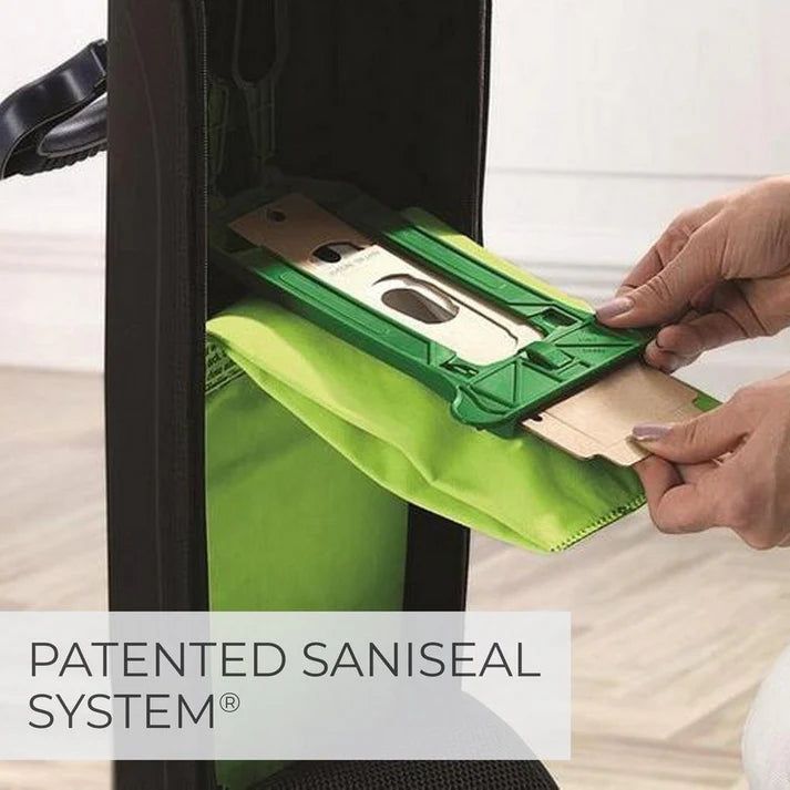 - SaniSeal® System automatically locks in allergen matter, dirt & debris upon disposal, significantly reducing the \"dust puff\" created by other vacuums.