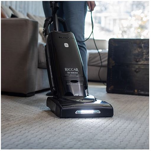 The R25 Deluxe is an advanced cleaning machine, built for power, performance, and ease of use. The R25D model has a self-adjusting nozzle that transitions beautifully from ultra-plush carpet to bare floors without scratching wood or blowing dust. Large rubber wheels, plus 360-degree casters and smaller rubber wheels mean the vacuum turns on a dime. Lower it to the floor for cleaning under furnishings easily, or stretch it a full 11 feet to clean crevices you never thought you'd reach with an upright vacuum.